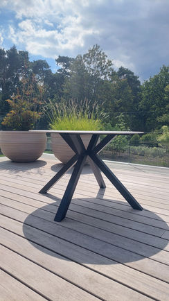 De aardewerk bloempotten zijn de eyecatchers van dit terras en dat mocht voor ons en de klant zo blijven. We gingen op zoek naar een tafelblad dat hierbij een perfecte match zou zijn zonder echter de aandacht op te eisen.